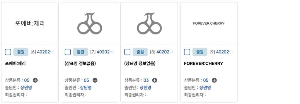 하지만 ‘forever cherry’와 체리 도형은 유명인의 성명이나 초상과 무관하다. 이러한 표지는 브랜드 협업 프로젝트 과정에서 노출될 수 있다. 만일 이러한 표지가 노출될 때 인지도가 높지 않은 상태에서 어떻게 보호할지 모호한 상황이 발생한다. 유명한 브랜드가 된다면 법적으로 보호받을 수 있지만, 브랜드 인지도가 높지 않은 애매한 상태에서 여러 다툼이 발생할 수 있다. 이러한 상황을 미연에 방지하고자 상표 9건을 출원한 것으로 추정된다.