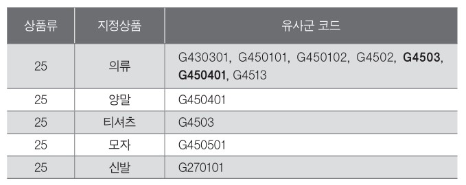 각 상품류의 해당 상품에 ‘유사군 코드’가 있다. ‘유사군 코드’란 말 그대로 상품 또는 서비스업의 유사범위를 표시하는 식별기호이다. 상품의 유사 여부를 결정하는 절대적 기준은 아니지만, 특허청에서 상표를 심사할 때 유사군 코드를 기준으로 상품의 유사 여부를 결정한다. 다음의 예시처럼, 제25류는 의류, 양말, 신발, 모자 등에 대한 상품류다. 의류의 유사군 코드는 여러 개인데, 여기에는 다양한 상품들이 포함되어 있으며 의류의 하위 개념인 티셔츠, 양말을 포함한다.